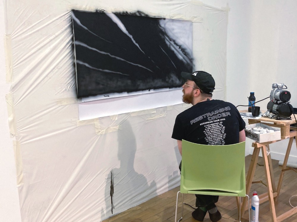 Némo Richard-Roussel has set up his studio at L'Artothèque. Come and discover his work! Némo graduated in June 2025 with a DNSEP in art from ESAM Caen/Cherbourg. Using D.I.Y. (Do It Yourself) strategies and techniques inherited from the cultures he grew up with (punk, graffiti, English rave, extreme metal), Némo attempts to transcribe, in a variety of forms and media (drawing, photography, video, text, etc.), the emotions and poetry hidden in his environment, the contrasts created by the insertion of radical cultural elements into the suburban landscapes that make up his daily life. His work is inhabited by spectres. They take the form of anonymous figures, sometimes masked, frozen in waiting postures, displaying subterranean signs of belonging, or abstract, ectoplasmic features that come to parasitise the images, composing a universe somewhere between a tag and a metal logo. These spectres, conceived as visual samples, are a way of evoking his relationship with the cultures he seizes upon, and the logic of quotation and nostalgia to which they are subjected.