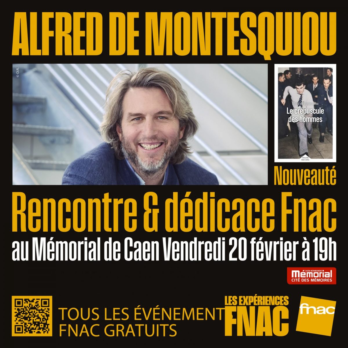 Meeting and FNAC book signing with Alfred de Montesquiou, film director and writer, about his book "Le Crépuscule des Hommes" at the Caen Memorial. Hosted by journalist Thibaut Boulais. Admission free, subject to availability.