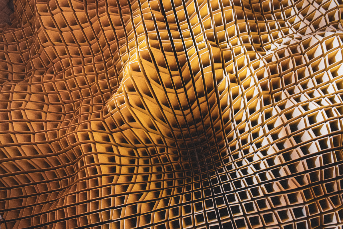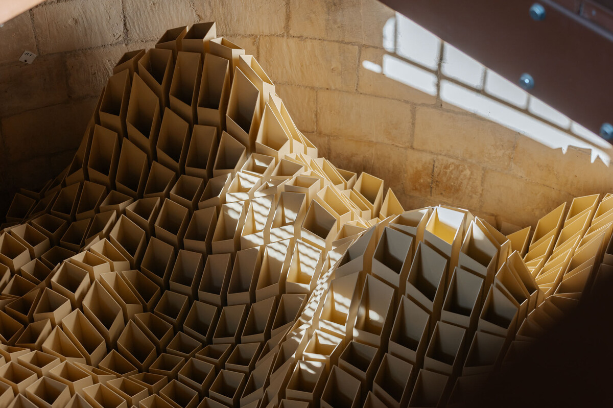 The work "La Pierre et le sablier" by Vincent Mauger, installed on the Puchot Tower of the Caen Castle, transforms the space into an exploration of time and space. Composed of metal blocks stacked at the top and a cavity carved at the bottom, the work resembles a giant hourglass, with shapes that seem to deform and flow, representing the passage of time. The blocks, made of aluminum plates, recall ancient building stones while being light and modular. A footbridge allows visitors to overlook the installation and observe its visual effect, creating a strange perception of depth. By integrating into the tower, a symbol of military power and resource exploitation, the work establishes a link between the past and the present, raising questions about time, space, and the way we use natural resources.