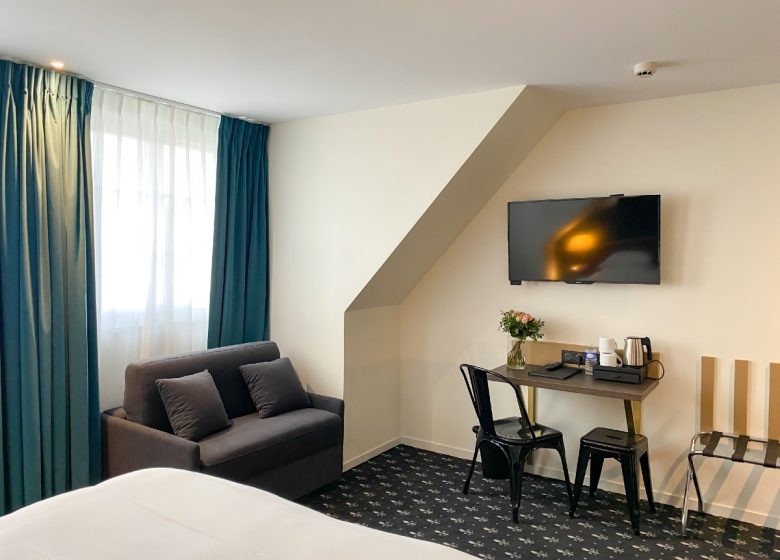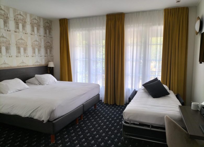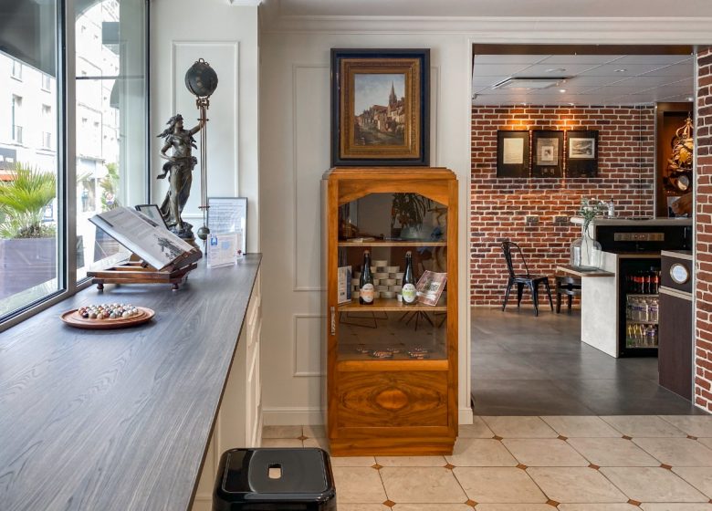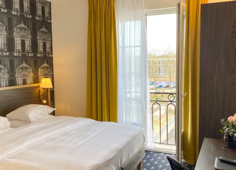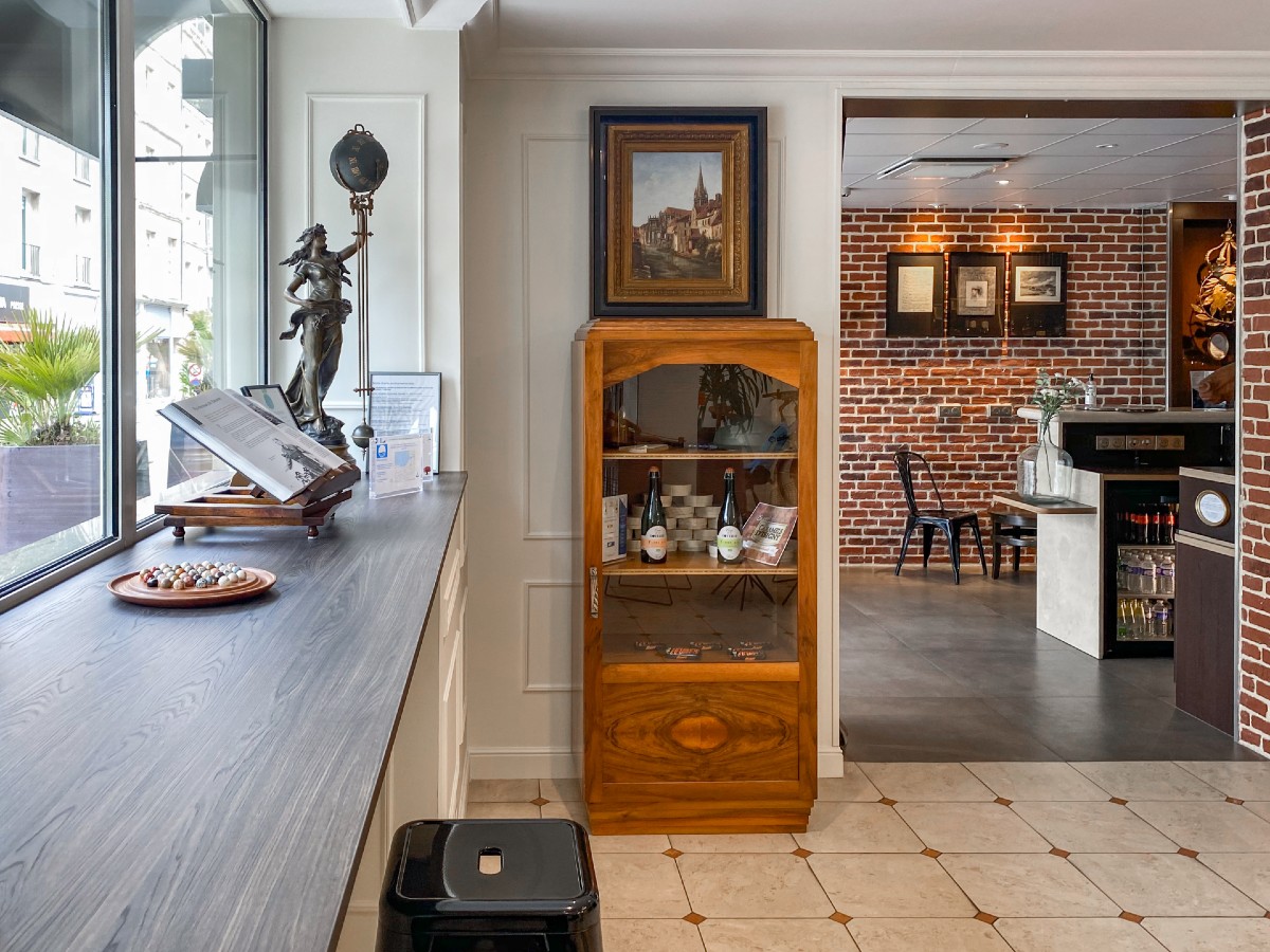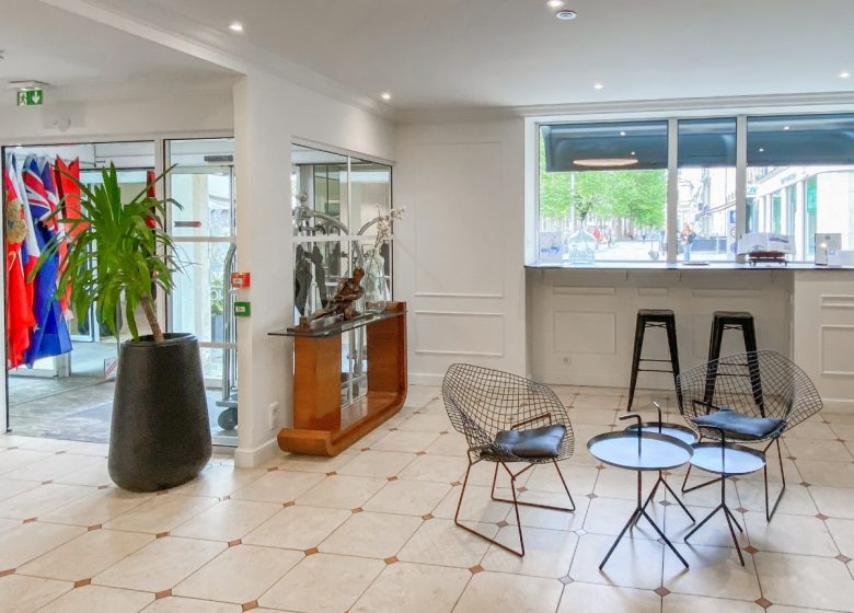 In the immediate vicinity of Caen's pedestrian district, the theatre, the congress centre and the restaurants, the Royal Hotel welcomes you day and night, all year round, in a renovated and restructured setting, fully air-conditioned, offering you a free Wi-Fi connection in all areas. Its 47 personalized and soundproofed rooms, individual and family, are all fully equipped. Our pleasant lounge-bar invites you to relax after a day of visits or work. Every morning, a hearty breakfast buffet awaits you in a cosy room, decorated with care, but you can prefer the pleasure of breakfast in bed.