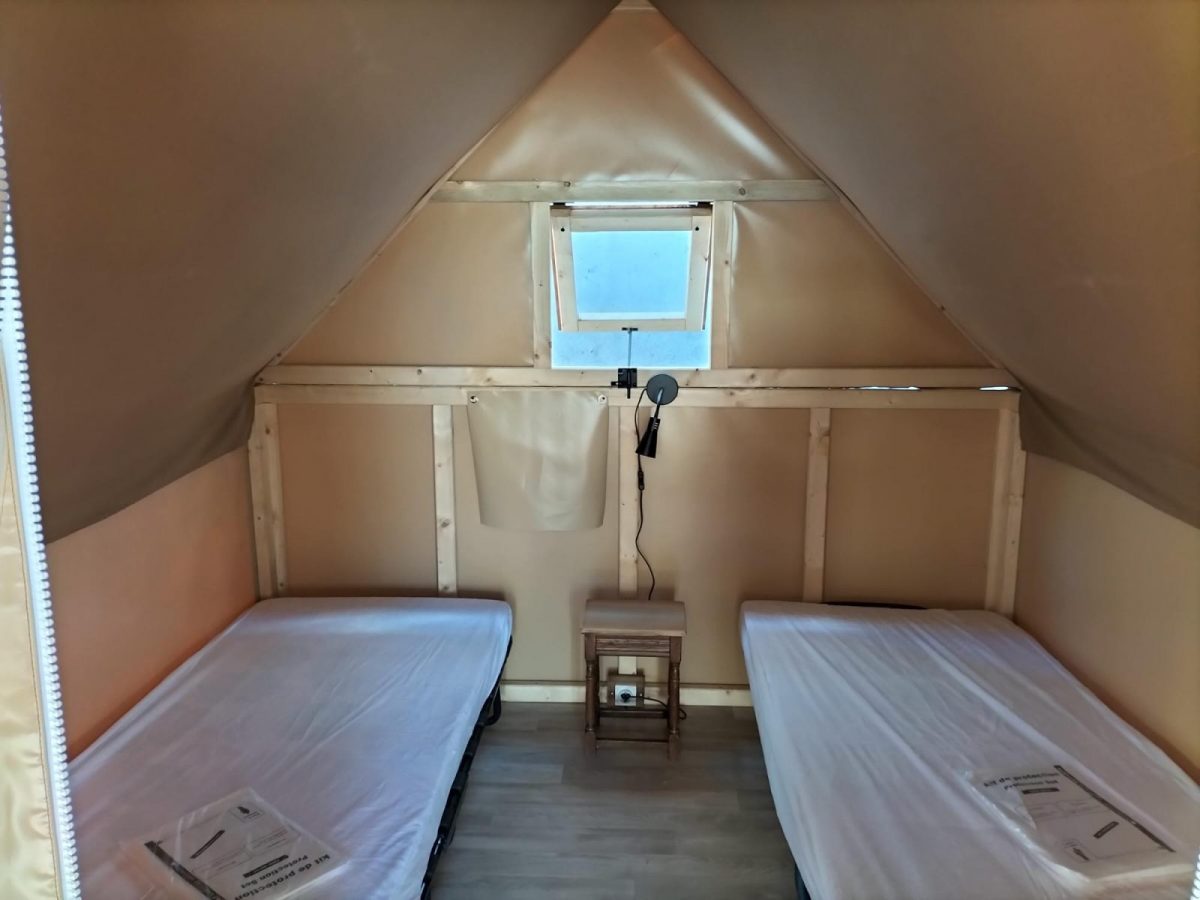 The cyclo'tente Marais, dedicated to cyclotourists, is a half-wood / half-canvas accommodation on a floor, including a night space of about 5 m² with 2 beds, (2 bedsprings on feet 80 X 190 with a mattress protected by a cover), an electric plug and a terrace with a canopy equipped with 2 chairs and a table.