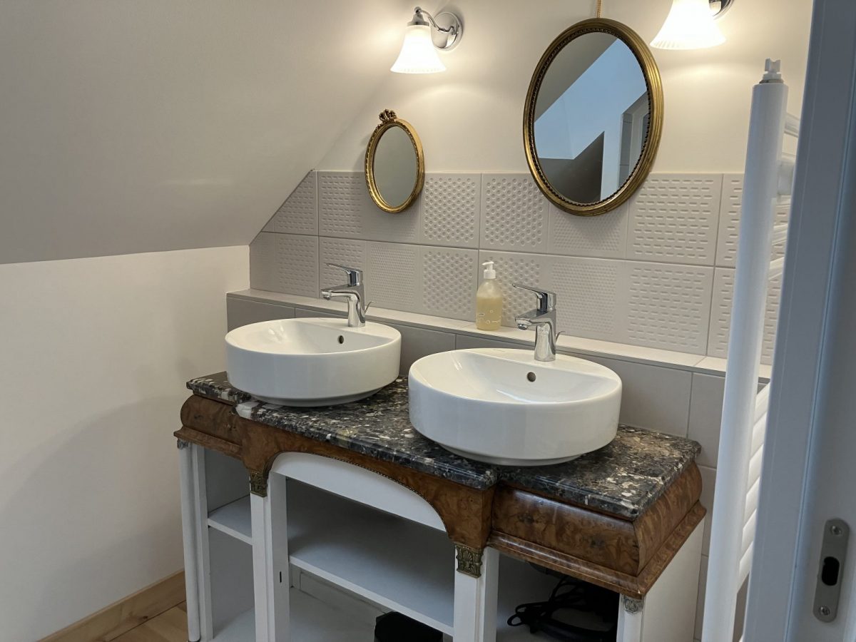 On the second floor, the family suite (Rosalie) with a room with three 90cm single beds (convertible to a 180cm bed) and a room with a 160cm double bed, a bathroom and a separate toilet. All bathrooms are equipped with showers.