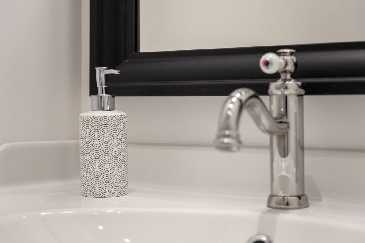 Bathroom with shower, towels and toiletries provided.