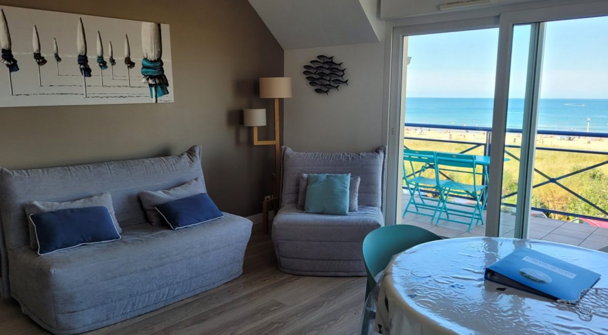 50m from the beach with a breathtaking view of the sea, 180° view of the coast, flat decorated with care, very well equipped, on the 2nd floor of a residence with lift, balcony overlooking the sea. Living room , kitchen 1 bedroom (bed 140) dressing room, bathroom, independent WC. Private garage. Shops at 200m. Nearby: casino, thalasso, aquatic centre, karting, horse riding centre. Cycle track at 50 m. Pedestrian path on the sea front in front of the flat.