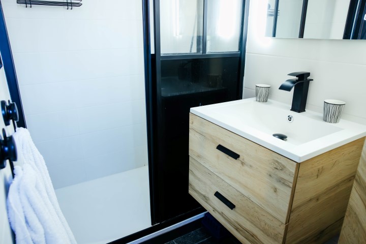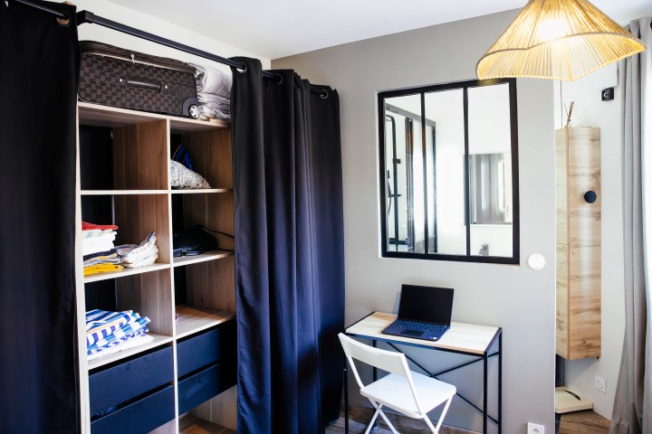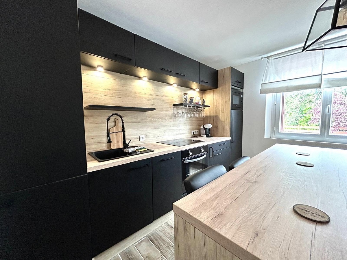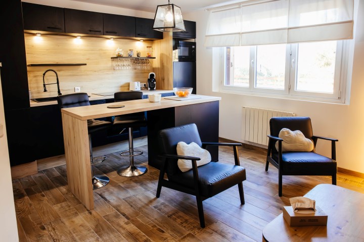The living room comprises a kitchen equipped with fridge, induction hob, oven, microwave, dishwasher and washing machine, and a lounge area with armchairs, Smart TV and WiFi. The bedroom has a 2-seater bed ready for your arrival, a shower room with washbasin, cupboards and walk-in shower. Separate WC. The apartment is located on the mezzanine (half-floor) of a small, quiet building with just 4 units.